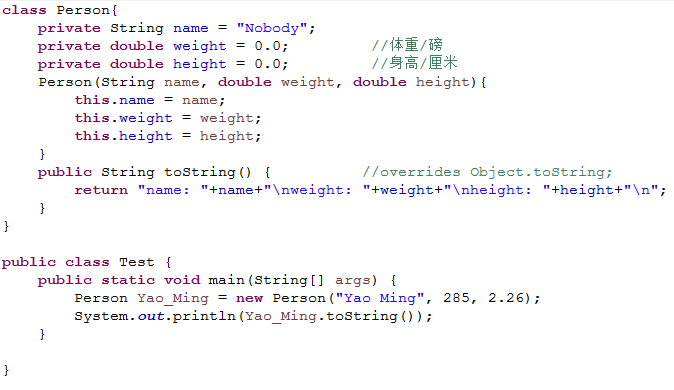 2. 编写一个Person类。该类包含三个成员变量name、weight和height,分别代表一个人的身高和体重。在该类中重写Object类的toString方法,当调用它重写的toString方法时,输出这个人的姓名、体重和身高。在报告中附上程序截图、运行结果截图和详细的文字说明。(20分)