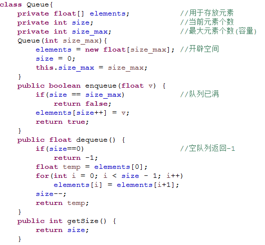 3.编写一个队列类Queue,用来存储float型数据,队列中的数据是先进先出的。具体要求如下:成员变量float [] elements用来存储float型数据;成员变量int size用来表示存储的float型数据的个数;构造方法Queue在初始化队列的时候,设置队列的容量为12;方法enqueue(float v)用来往队列中添加一个float型数据;方法dequeue()用从队列中删除并返回一个float型数据;方法getSize()用来返回队列的大小。在报告中附上程序截图、运行结果截图和详细的文字说明。(20分)