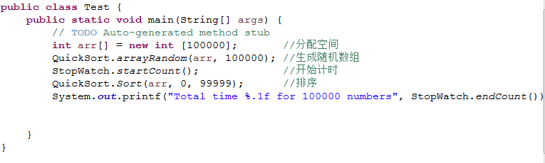 4.编写一个秒表类StopWatch,成员变量和方法自定。编写一个支持快速排序算法的类QuickSort,成员变量和方法自定。对100000, 1000000, …等不同长度的数组中的元素(元素的值随机给定)进行排序,并用秒表对象来记录排序所用的时间。在报告中附上程序截图、运行结果截图和详细的文字说明。(20分)