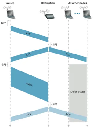 - Destination在收到RTS帧之后决定是否回应CTS,若回应则需要等待在称为最短帧间空间 (SIFS) 的短时间后发送CTS