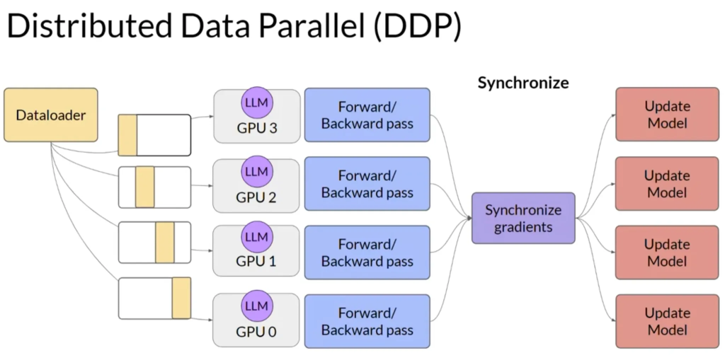 - DDP将模型复制到每个GPU并并行发送数据批次。每个GPU上的数据被并行处理然后通过同步步骤合并每个GPU的结果来更新模型。
