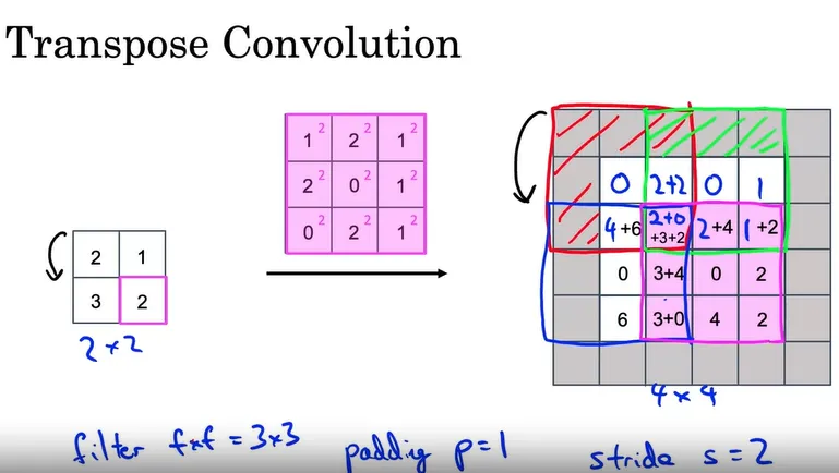 通过这种方式,转置卷积可以将小尺寸的输入图像扩展到更大的尺寸,这是在 U-Net 架构中进行语义分割的关键步骤。