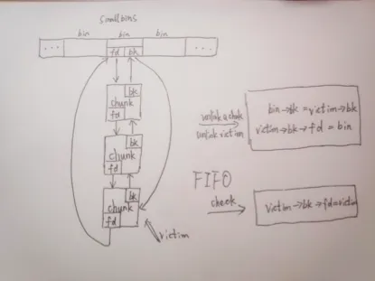 這個時候smallbin的拓撲結構如上圖所示。留意smallbin始終時FIFO這個原則是不變的,以及從smallbin中取出chunk時候需要進行的操作和檢查。