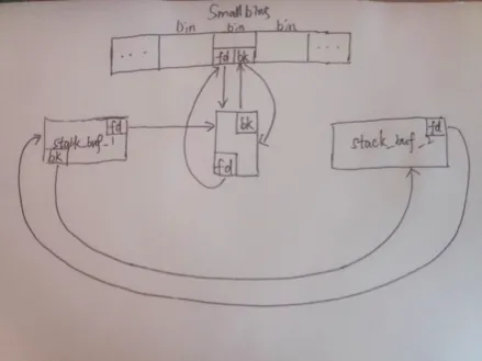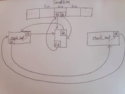 在這裡fake free list被用在stack_buffer_2的背後bk指針,確保smallbin這條鏈足夠長。