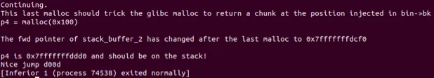 fprintf(stderr, "\\nThe fwd pointer of stack_buffer_2 has changed after the last malloc to %p\\n",