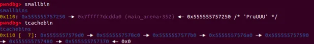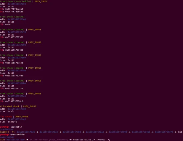 這之後,第一個victim進入了unsortedbin。這個時候的victim還是未被篡改過的chunk。接著的7個chunk填充了tcachebin。
