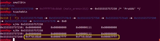 基於這樣一個事實:我們要從smallbin中拿到chunk,就必須tcachebin為空,而我們又要將smallbin剩下的chunk加入tcachebin直到7個。
