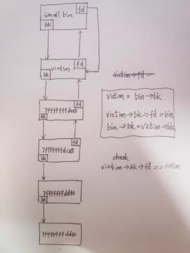 unlink会进行的操作是:victim->bk->fd = bin, bin->bk = vimtim->bk