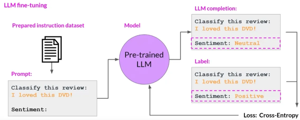 - 与使用大量非结构化文本数据进行预训练不同,微调是一种有监督学习过程。