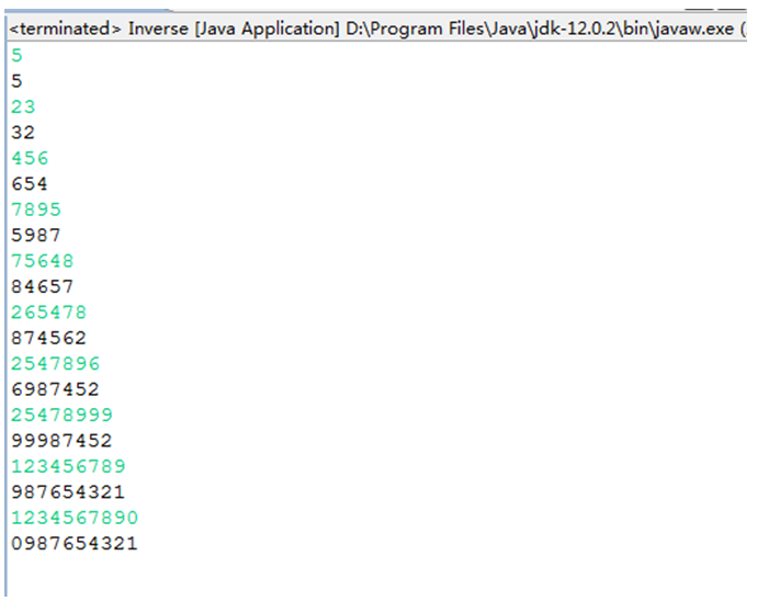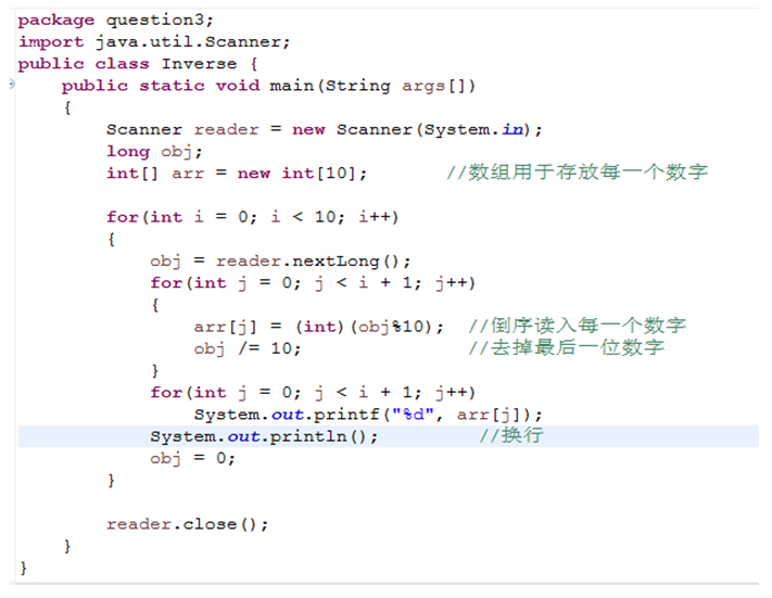 3. 编写程序:用户从键盘输入10个正整数(这10个正整数分别包含1、2、3、4、5、6、7、8、9和10个数字),程序逆序打印出每个正整数的各位数字(例如:某个正整数为34567,程序输出76543)。在报告中附上程序截图、运行结果截图和详细的文字说明。