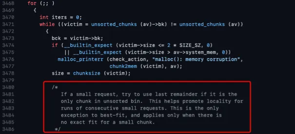 否则在后面会再次遍历unsortedbin,将所有不是best fit的chunks加入到smallbin或者largebin中。当然如果这个过程中遇到有best fit的unsorted bin还是会直接返回的。