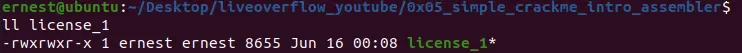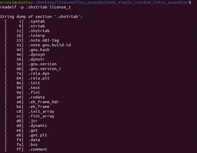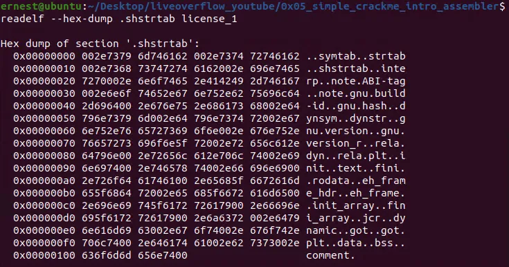 可以执行hexdump -C license_1命令打印文件中每个字节的数值,然后根据文件偏移量sh_offset(如0x109d)和该section的大小sh_entsize(如0x108)来获取.shstrtab section的所有内容,如下图所示: