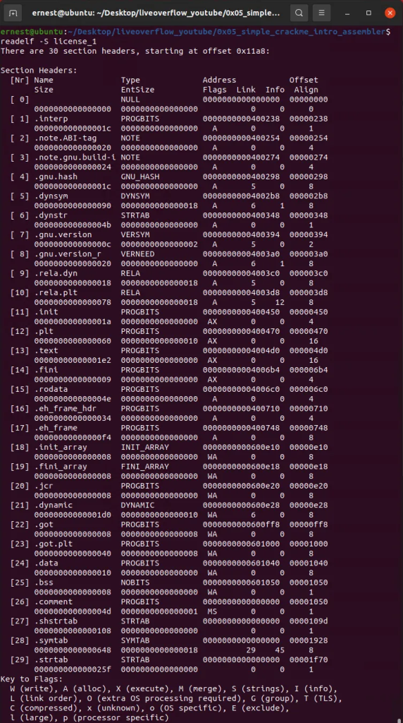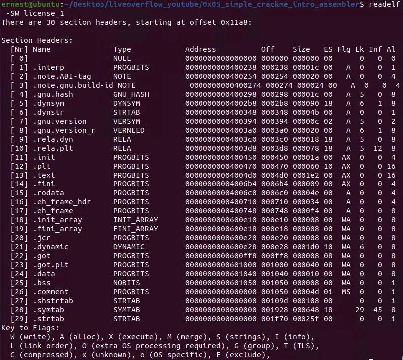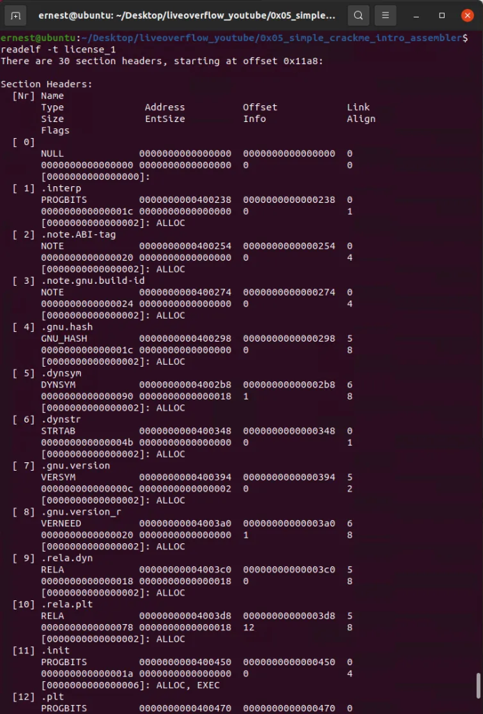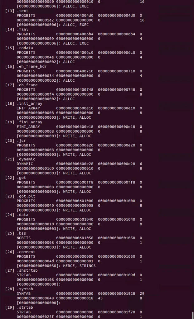 通过执行readelf命令可获得可执行文件中所有的section header信息,如下所示: