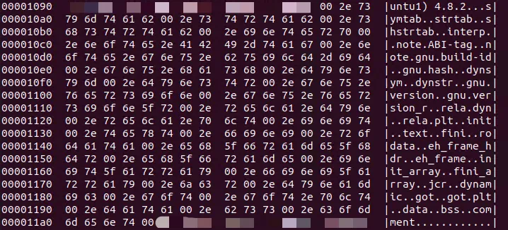 命令hexdump对非打印字符采用点(﹒)来代替,在上图中为了区分section名称前的点,则将空字符对应的点用空格代替。