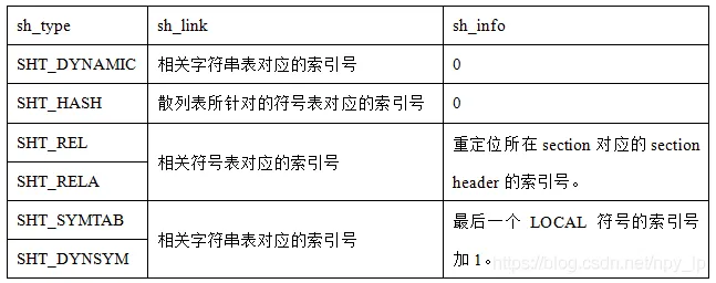 sh_info表示附加的段信息。以上这两个成员的值只对以下表中的section类型有效,其他类型的值都section为0。