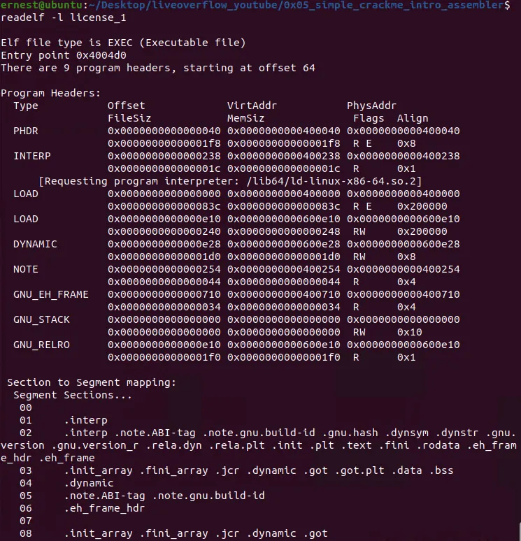 通过执行readelf命令可获得可执行文件中所有的program header信息,如下所示:
