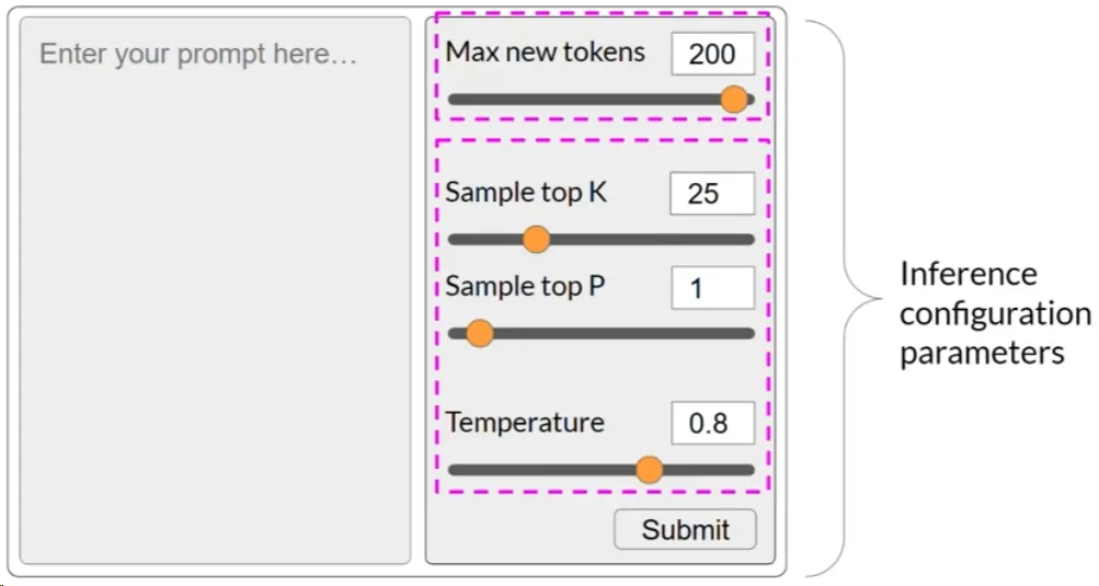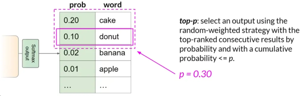 - 将随机采样限制在其组合概率不超过P的预测中。例如,如果P设置为0.3,模型将从概率为0.2和0.1的选项中选择。