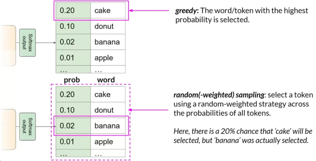 - 引入变化性的简单方法。模型根据概率分布随机选择输出词而不是总是选择最有可能的词.