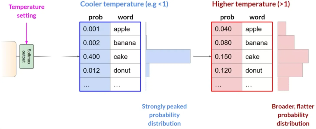 - 温度值是在模型的最终softmax层内应用的缩放因子,影响下一个令牌的概率分布的形状。