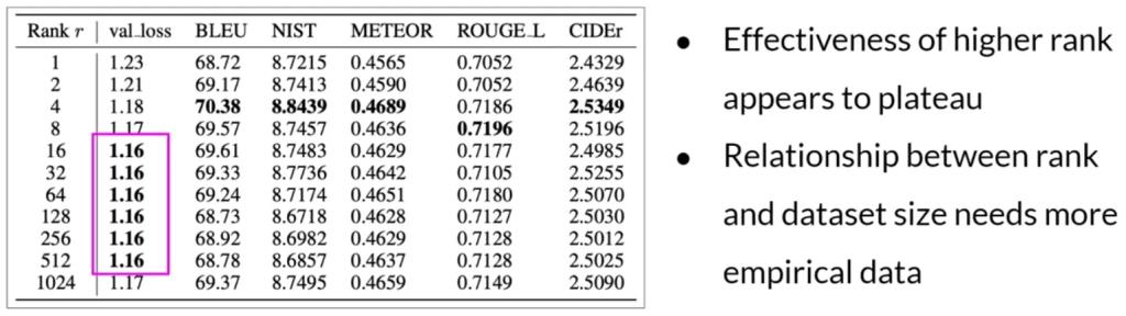 - 排名在4-32的范围内可以提供减少可训练参数与保持性能之间的良好折衷。