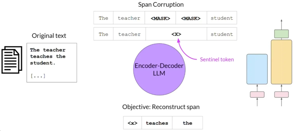 遮蔽输入令牌的随机序列。这些被遮蔽的序列随后会被一个独特的哨兵令牌(Sentinel token)所替换,如这里所示为x。哨兵令牌是添加到词汇表中的特殊令牌,但并不对应于输入文本中的任何实际单词。解码器的任务是自回归地重构被遮蔽的令牌序列。