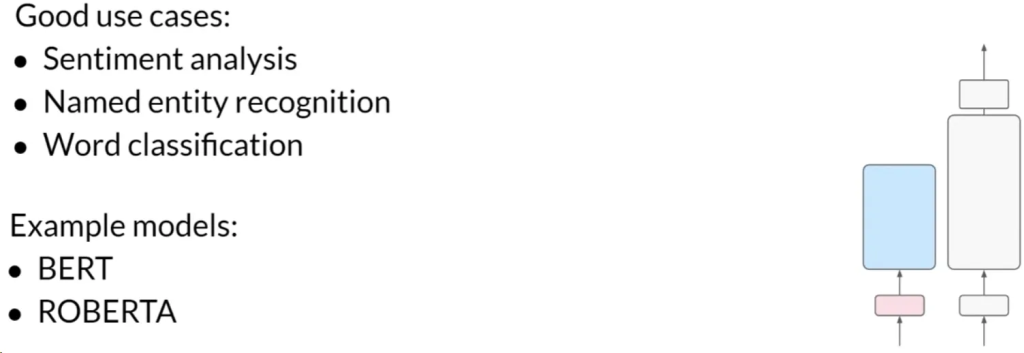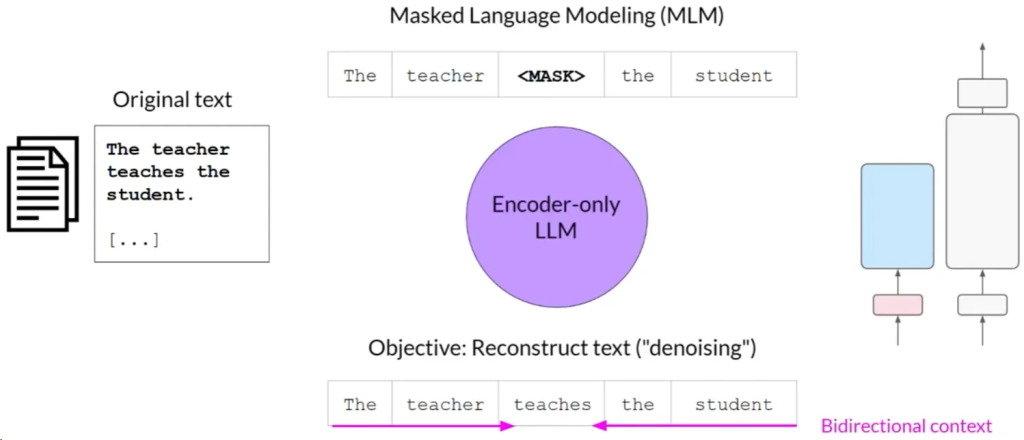 - 仅编码器模型(Autoencoding):使用MLM进行预训练,适用于句子分类和令牌级任务(例如BERT和RoBERTa)。