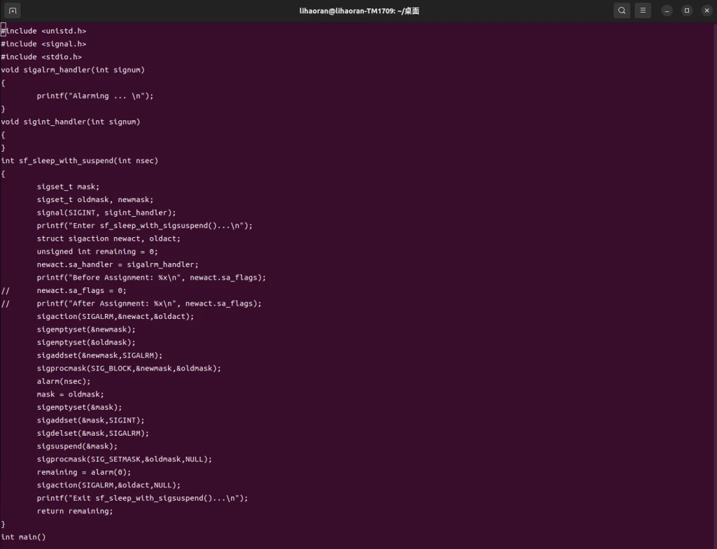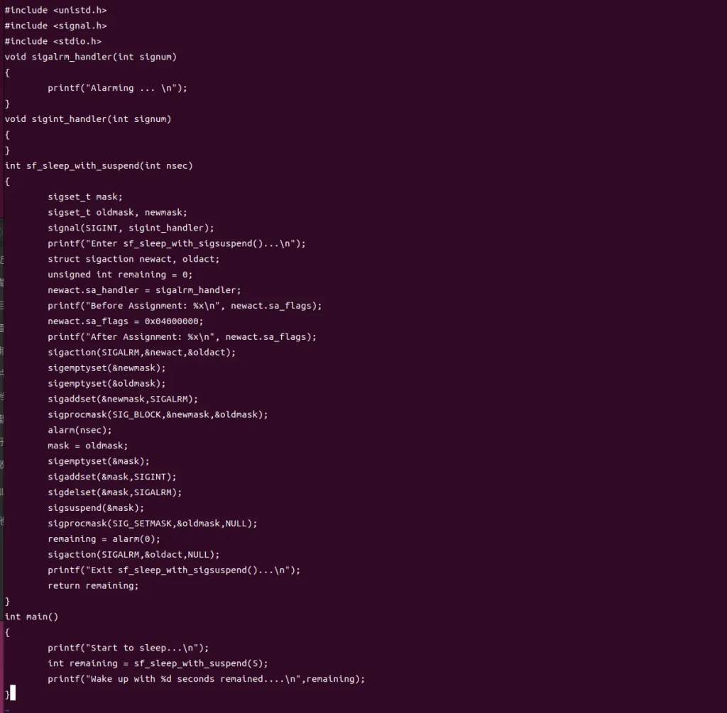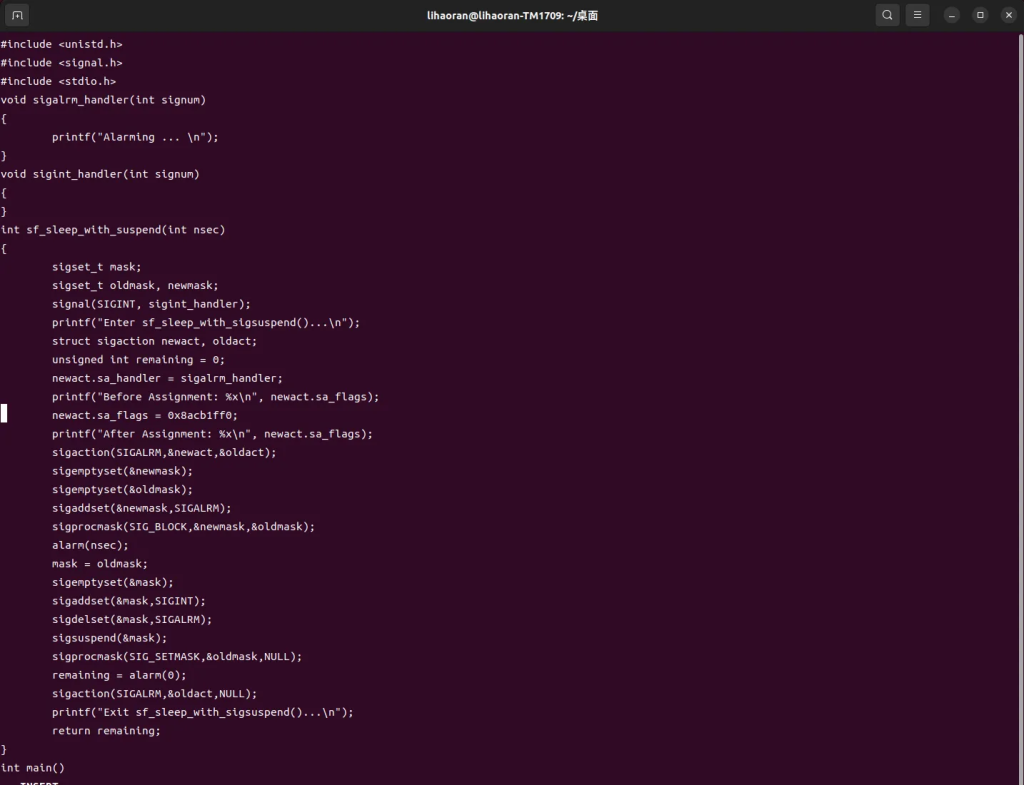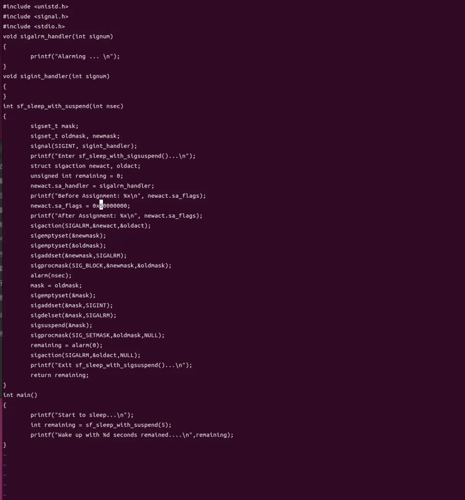 首先注释newact.sa_flags = 0,并在该行(newact.sa_flags = 0)之前打印newact.sa_flags的值: