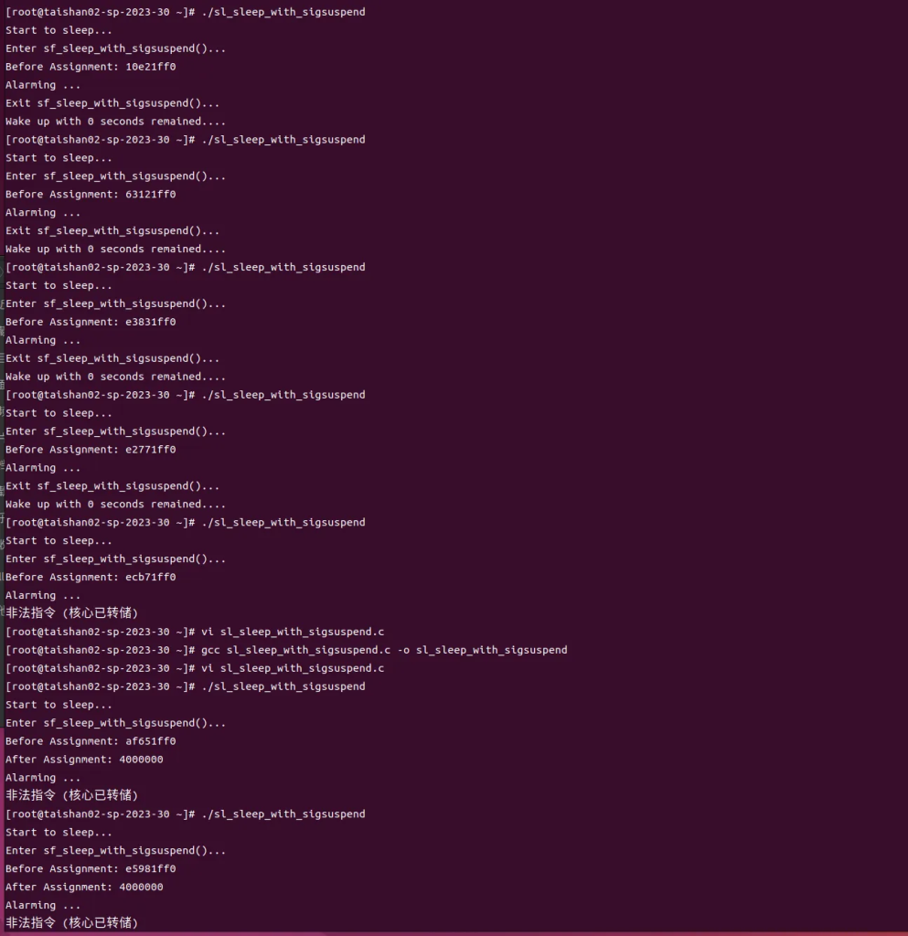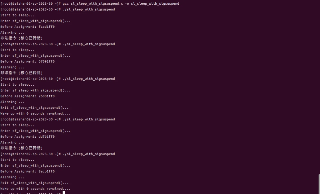 5次运行输出的newact.sa_flags(未初始化)均不相同;其中第1、2、4次发生了coredump;
