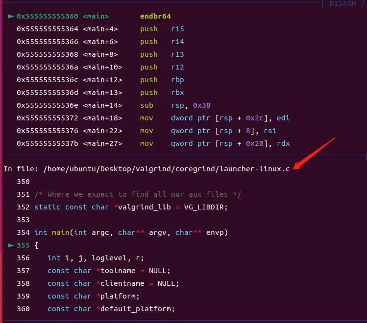 Breakpoint 1, main (argc=argc@entry=2, argv=argv@entry=0x7fffffffe408, envp=0x7fffffffe420) at launcher-linux.c:355
