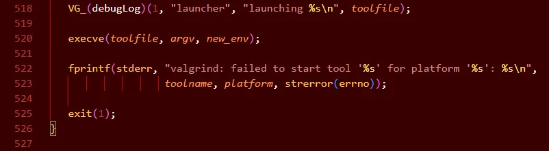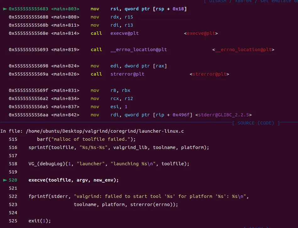 可以看到/home/ubuntu/Desktop/valgrind/coregrind/launcher-linux.c:520处调用memcheck-amd64-linux
