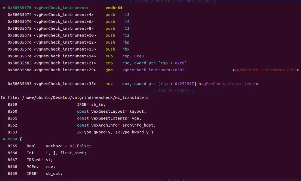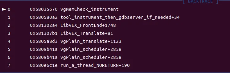 - memcheck/mc_translate.c:MC_(instrument):valgrind_main.isra→ run_a_thread_NORETURN+190→[vgPlain_scheduler+2858→vgPlain_scheduler+2858] or [vgPlain_scheduler+1662→handle_chain_me+171]→LibVEX_Translate+81→ LibVEX_FrontEnd+1748→tool_instrument_then_gdbserver_if_needed+34→ vgMemCheck_instrument