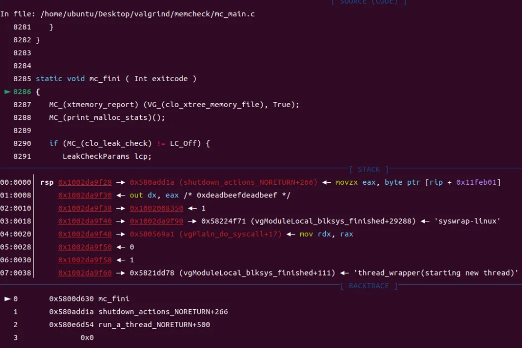 - memcheck/mc_main.c:mc_fini:run_a_thread_NORETURN+500→ shutdown_actions_NORETURN+266 → mc_fini
