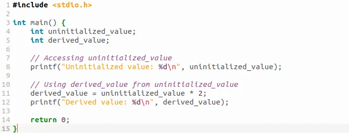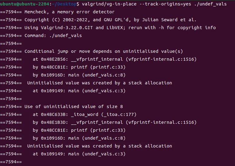 当你的程序使用一个未被初始化(即未定义)的值时,会报告一个未初始化值使用错误。在这里,未定义的值被用于C库的printf机制的某个地方。这个错误是在运行以下程序时报告的: